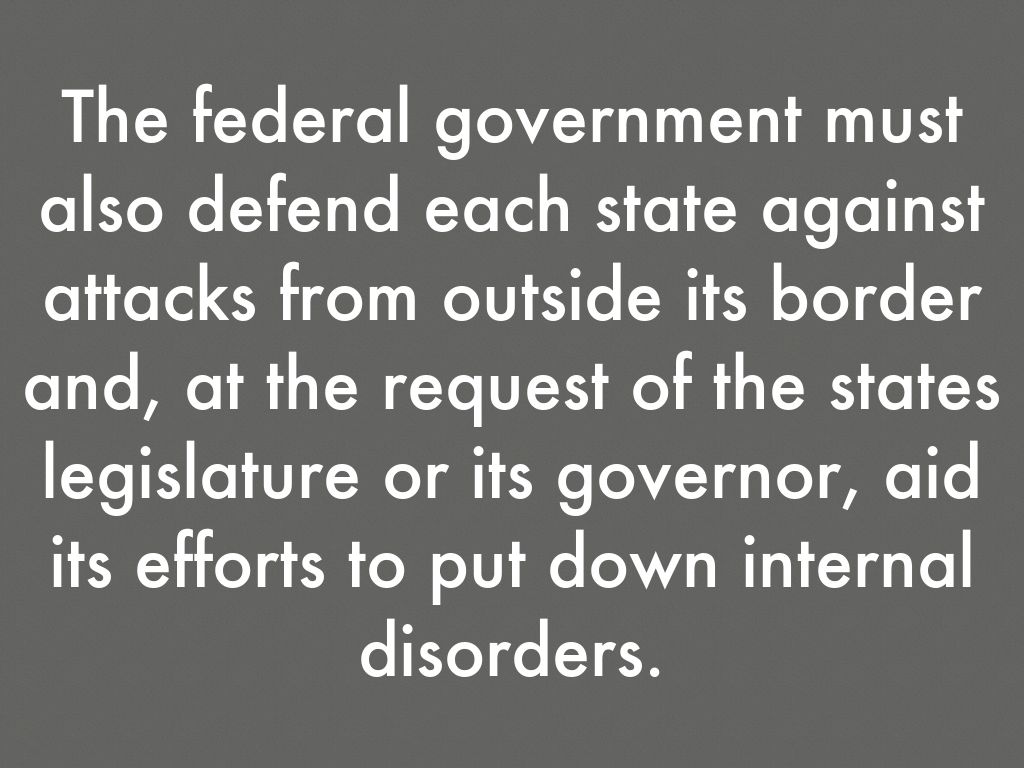 The federal government must also defend each state against attacks from outside its border and, at the request of the states legislature or its governor, aid its efforts to put down internal disorders.