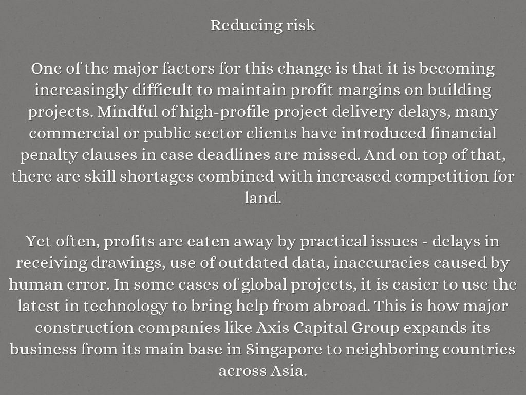 Yet often, profits are eaten away by practical issues - delays in receiving drawings, use of outdated data, inaccuracies caused by human error. In some cases of global projects, it is easier to use the latest in technology to bring help from abroad. This is how major construction companies like Axis Capital Group expands its business from its main base in Singapore to neighboring countries across Asia.