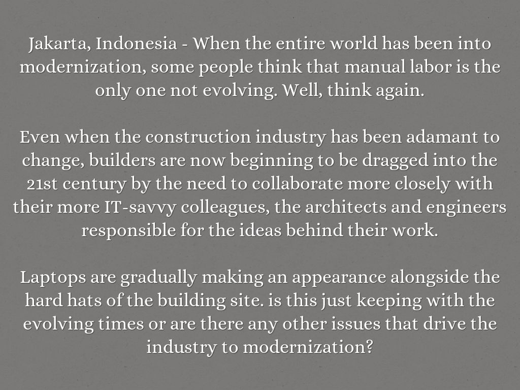 Laptops are gradually making an appearance alongside the hard hats of the building site. is this just keeping with the evolving times or are there any other issues that drive the industry to modernization?