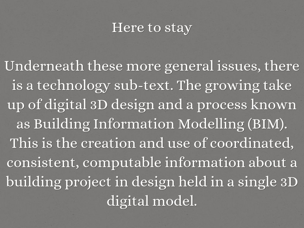 Underneath these more general issues, there is a technology sub-text. The growing take up of digital 3D design and a process known as Building Information Modelling (BIM). This is the creation and use of coordinated, consistent, computable information about a building project in design held in a single 3D digital model.