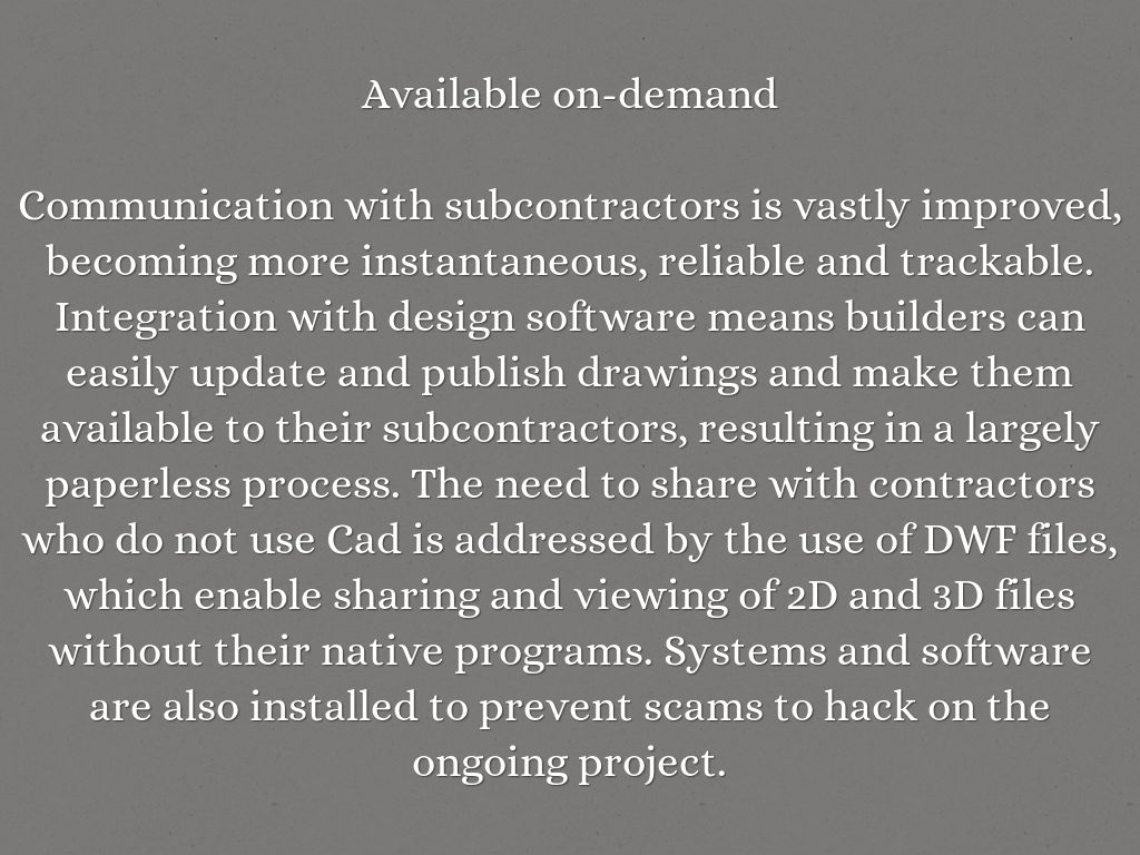 Communication with subcontractors is vastly improved, becoming more instantaneous, reliable and trackable. Integration with design software means builders can easily update and publish drawings and make them available to their subcontractors, resulting in a largely paperless process. The need to share with contractors who do not use Cad is addressed by the use of DWF files, which enable sharing and viewing of 2D and 3D files without their native programs. Systems and software are also installed to prevent scams to hack on the ongoing project.