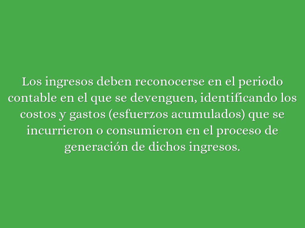 Los ingresos deben reconocerse en el periodo contable en el que se devenguen, identificando los costos y gastos (esfuerzos acumulados) que se incurrieron o consumieron en el proceso de generación de dichos ingresos.