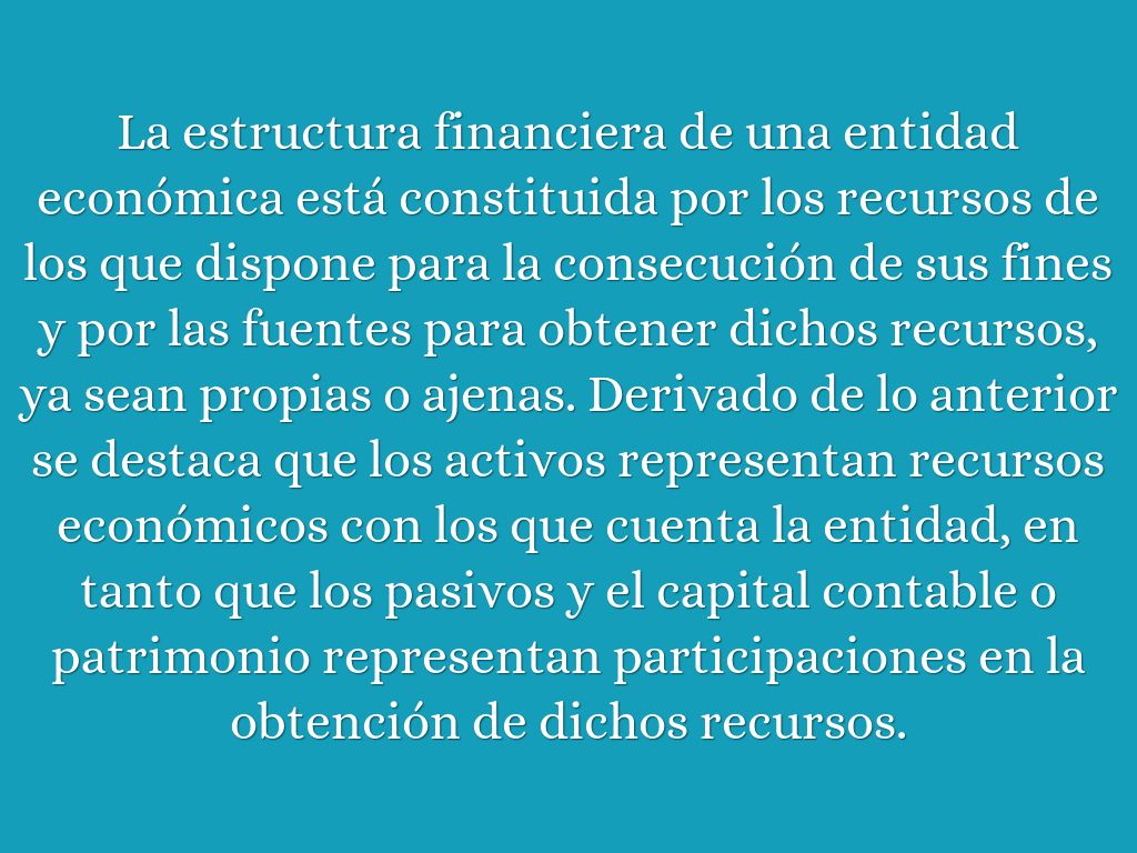 La estructura financiera de una entidad económica está constituida por los recursos de los que dispone para la consecución de sus fines y por las fuentes para obtener dichos recursos, ya sean propias o ajenas. Derivado de lo anterior se destaca que los activos representan recursos económicos con los que cuenta la entidad, en tanto que los pasivos y el capital contable o patrimonio representan participaciones en la obtención de dichos recursos.