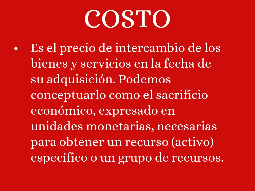 • Es el precio de intercambio de los bienes y servicios en la fecha de su adquisición. Podemos conceptuarlo como el sacrificio económico, expresado en unidades monetarias, necesarias para obtener un recurso (activo) específico o un grupo de recursos.