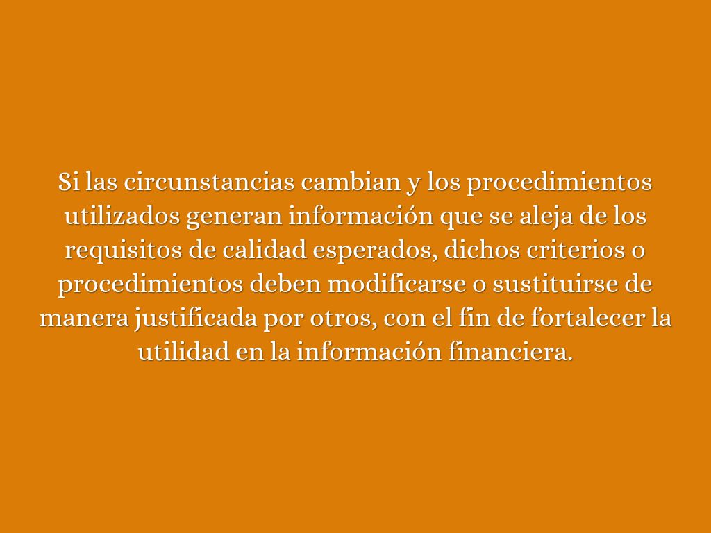 Si las circunstancias cambian y los procedimientos utilizados generan información que se aleja de los requisitos de calidad esperados, dichos criterios o procedimientos deben modificarse o sustituirse de manera justificada por otros, con el fin de fortalecer la utilidad en la información financiera.