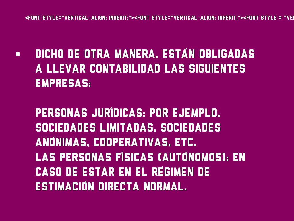 • Dicho de otra manera, están obligadas a llevar contabilidad las siguientes empresas: Personas jurídicas: por ejemplo, sociedades limitadas, sociedades anónimas, cooperativas, etc. Las personas físicas (autónomos): en caso de estar en el régimen de estimación directa normal.