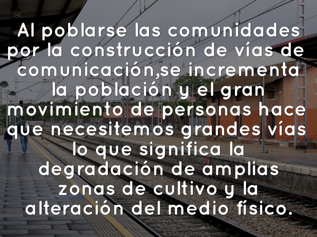 Al poblarse las comunidades por la construcción de vías de comunicación,se incrementa la población y el gran movimiento de personas hace que necesitemos grandes vías lo que significa la degradación de amplias zonas de cultivo y la alteración del medio físico.