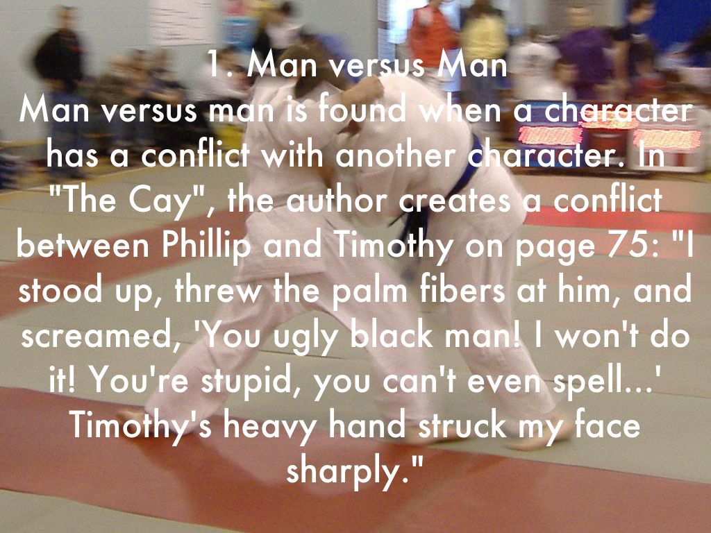 1. Man versus Man Man versus man is found when a character has a conflict with another character. In "The Cay", the author creates a conflict between Phillip and Timothy on page 75: "I stood up, threw the palm fibers at him, and screamed, 'You ugly black man! I won't do it! You're stupid, you can't even spell...' Timothy's heavy hand struck my face sharply."