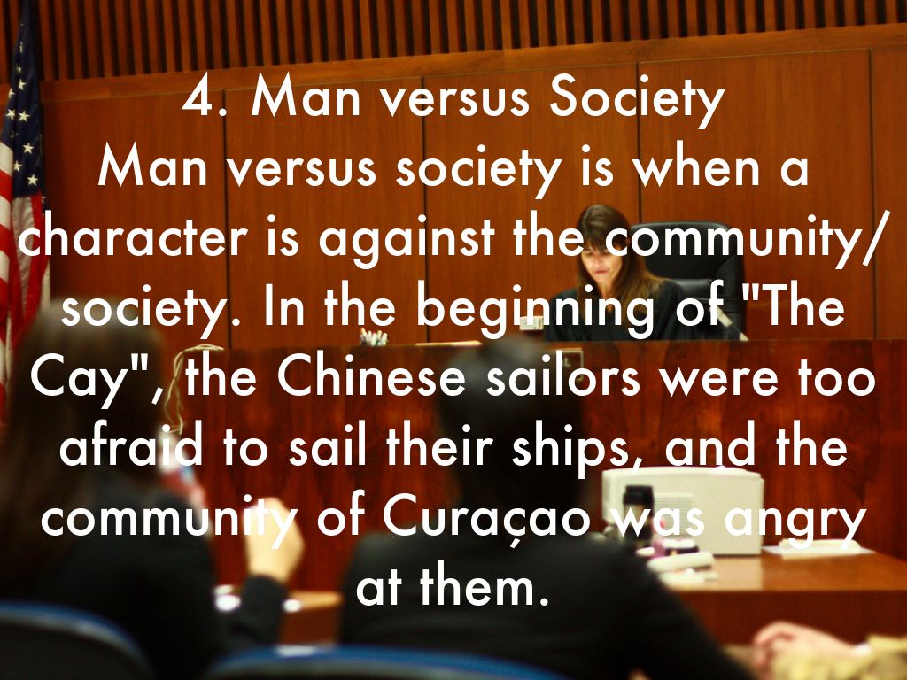 4. Man versus Society Man versus society is when a character is against the community/ society. In the beginning of "The Cay", the Chinese sailors were too afraid to sail their ships, and the community of Curaçao was angry at them.