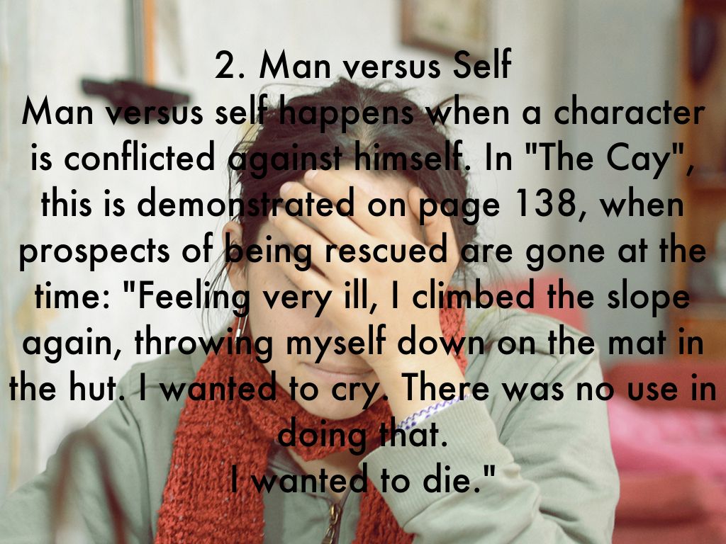 2. Man versus Self Man versus self happens when a character is conflicted against himself. In "The Cay", this is demonstrated on page 138, when prospects of being rescued are gone at the time: "Feeling very ill, I climbed the slope again, throwing myself down on the mat in the hut. I wanted to cry. There was no use in doing that. I wanted to die."