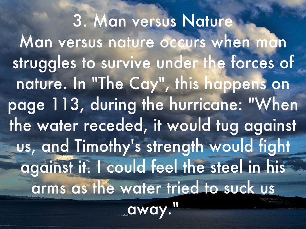 3. Man versus Nature Man versus nature occurs when man struggles to survive under the forces of nature. In "The Cay", this happens on page 113, during the hurricane: "When the water receded, it would tug against us, and Timothy's strength would fight against it. I could feel the steel in his arms as the water tried to suck us away."