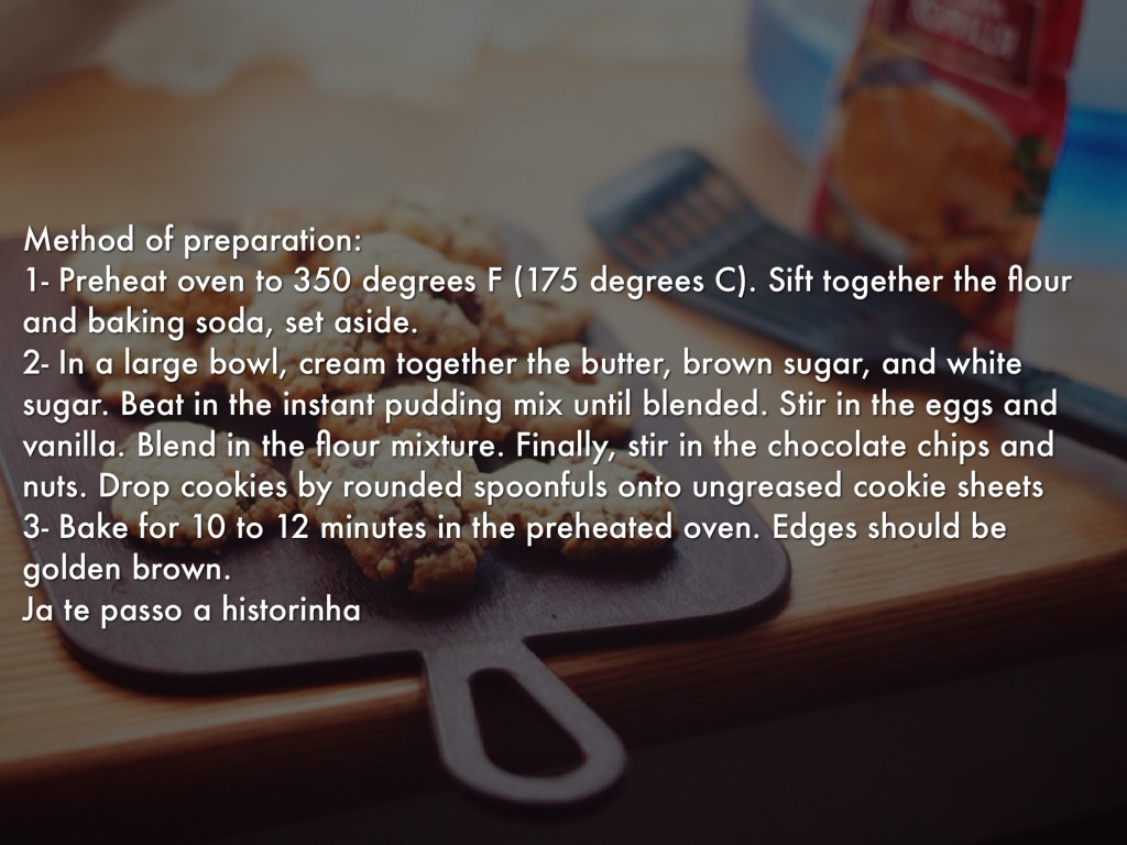 Method of preparation: 1- Preheat oven to 350 degrees F (175 degrees C). Sift together the flour and baking soda, set aside. 2- In a large bowl, cream together the butter, brown sugar, and white sugar. Beat in the instant pudding mix until blended. Stir in the eggs and vanilla. Blend in the flour mixture. Finally, stir in the chocolate chips and nuts. Drop cookies by rounded spoonfuls onto ungreased cookie sheets 3- Bake for 10 to 12 minutes in the preheated oven. Edges should be golden brown. Ja te passo a historinha