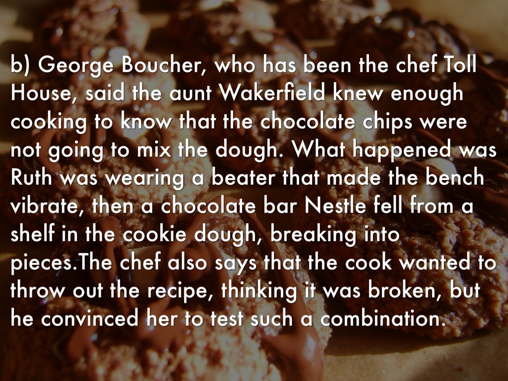 b) George Boucher, who has been the chef Toll House, said the aunt Wakerfield knew enough cooking to know that the chocolate chips were not going to mix the dough. What happened was Ruth was wearing a beater that made the bench vibrate, then a chocolate bar Nestle fell from a shelf in the cookie dough, breaking into pieces.The chef also says that the cook wanted to throw out the recipe, thinking it was broken, but he convinced her to test such a combination.