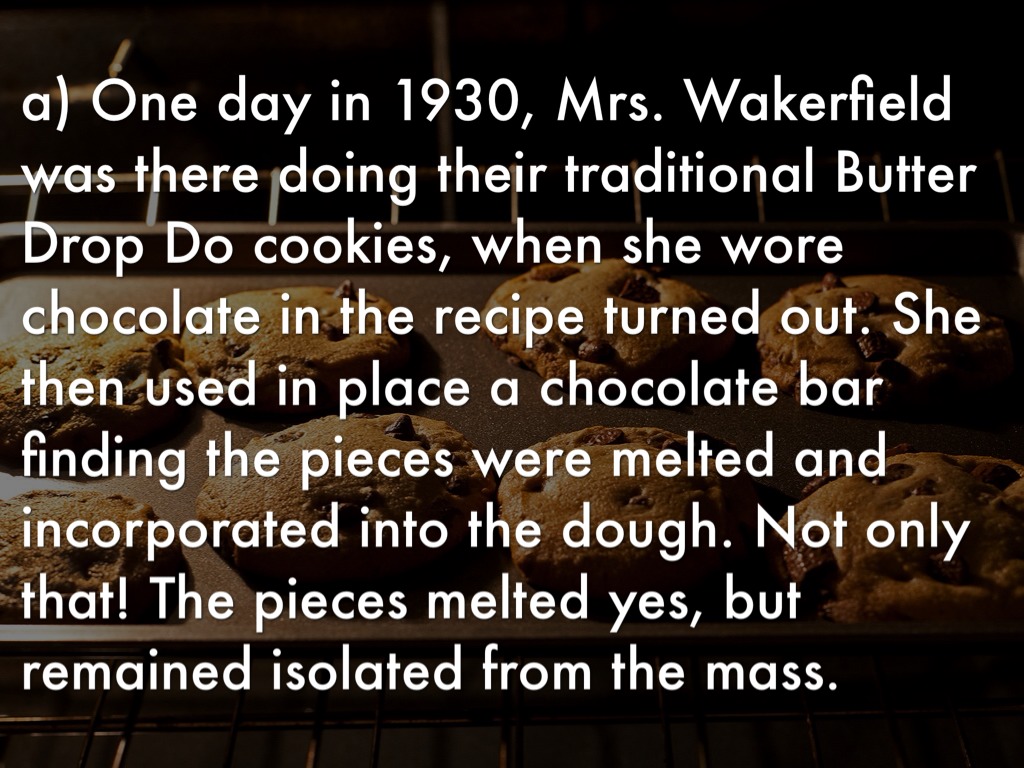 a) One day in 1930, Mrs. Wakerfield was there doing their traditional Butter Drop Do cookies, when she wore chocolate in the recipe turned out. She then used in place a chocolate bar finding the pieces were melted and incorporated into the dough. Not only that! The pieces melted yes, but remained isolated from the mass.