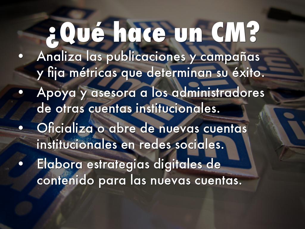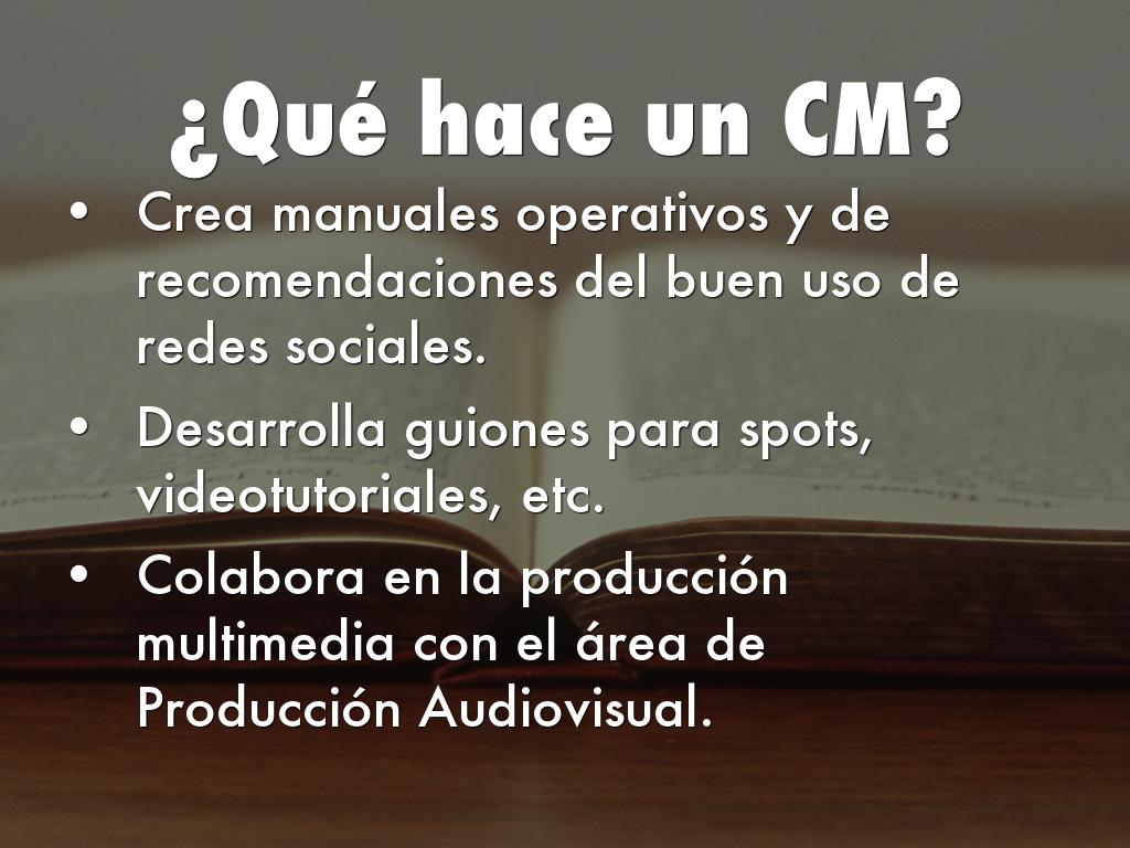 El community manager se encarga de la redacción de los mensajes (no es lo mismo publicar en Fb o en Tw), contestar dudas, monitorear, buscar la información a publicar, adaptar el contenido a multiformato o generar el contenido. También colabora en la producción audiovisual.