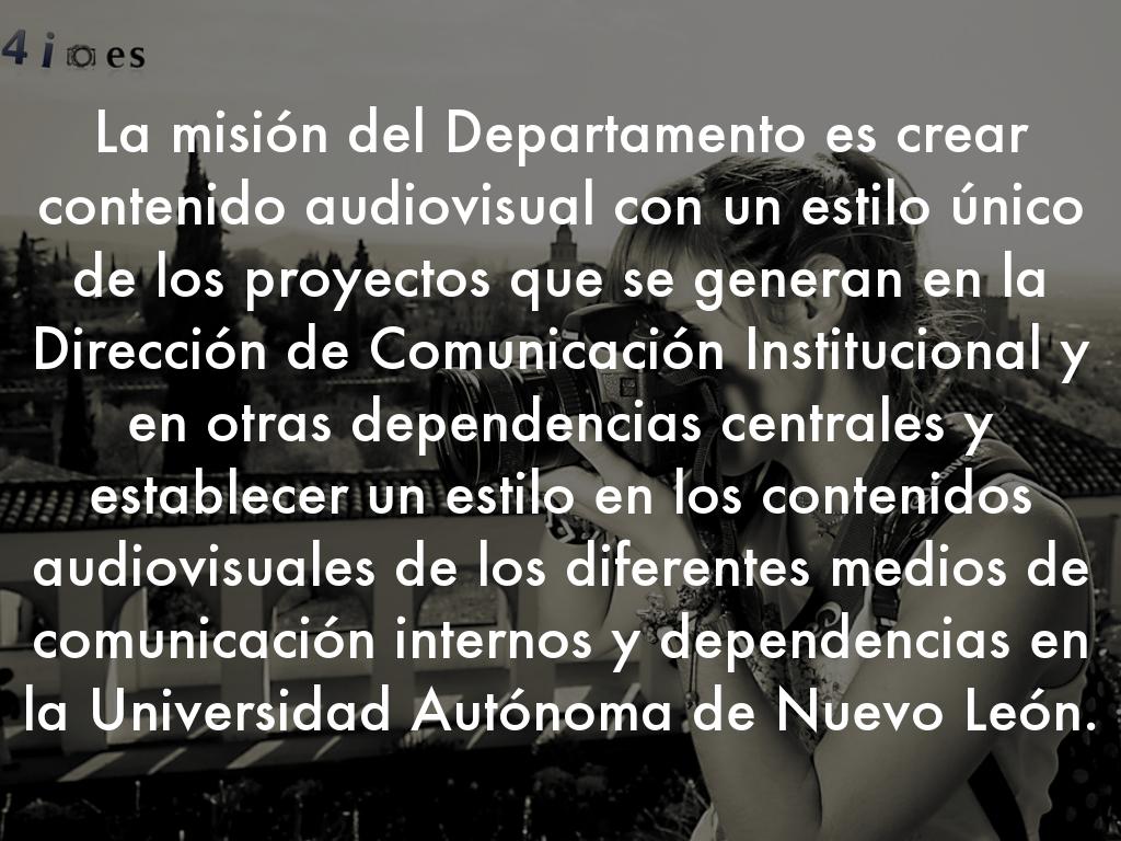 La misión del Departamento es crear contenido audiovisual con un estilo único de los proyectos que se generan en la Dirección de Comunicación Institucional y en otras dependencias centrales y establecer un estilo en los contenidos audiovisuales de los diferentes medios de comunicación internos y dependencias en la Universidad Autónoma de Nuevo León.