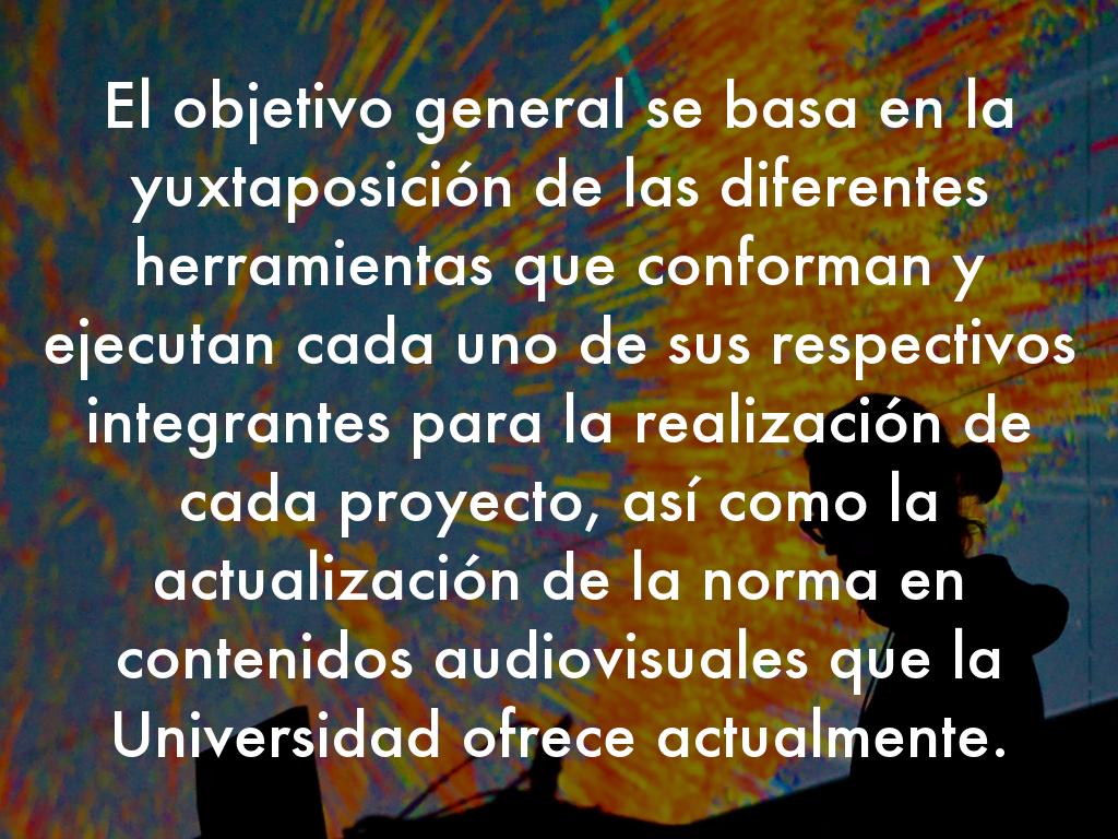 El objetivo general se basa en la yuxtaposición de las diferentes herramientas que conforman y ejecutan cada uno de sus respectivos integrantes para la realización de cada proyecto, así como la actualización de la norma en contenidos audiovisuales que la Universidad ofrece actualmente.