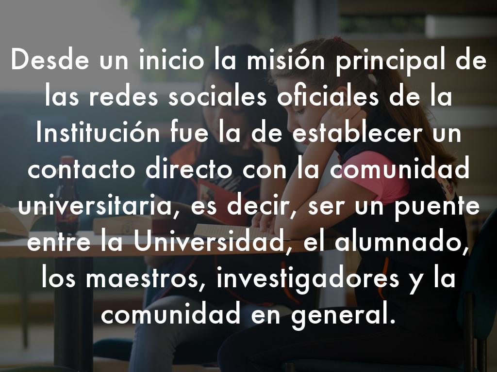 Desde un inicio la misión principal de las redes sociales oficiales de la Institución fue la de establecer un contacto directo con la comunidad universitaria, es decir, ser un puente entre la Universidad, el alumnado, los maestros, investigadores y la comunidad en general.