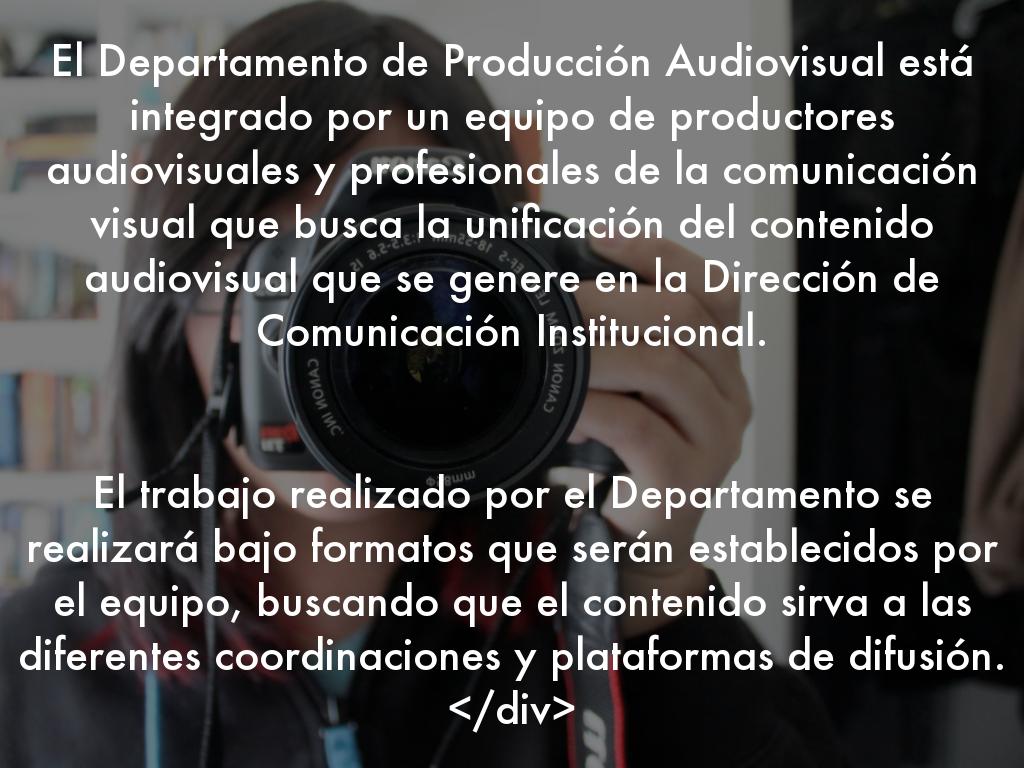 El Departamento de Producción Audiovisual está integrado por un equipo de productores audiovisuales y profesionales de la comunicación visual que busca la unificación del contenido audiovisual que se genere en la Dirección de Comunicación Institucional.