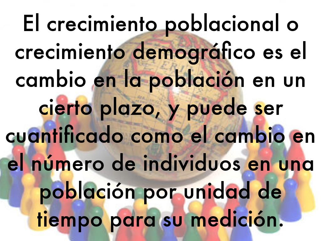 El crecimiento poblacional o crecimiento demográfico es el cambio en la población en un cierto plazo, y puede ser cuantificado como el cambio en el número de individuos en una población por unidad de tiempo para su medición.