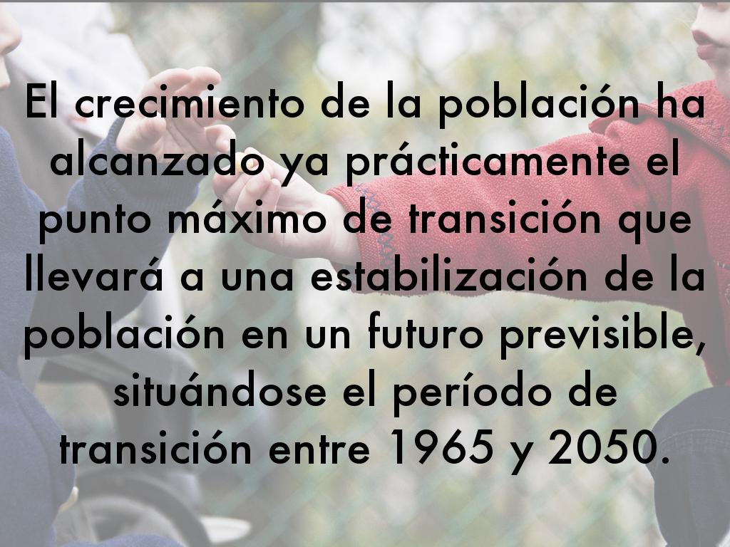 El crecimiento de la población ha alcanzado ya prácticamente el punto máximo de transición que llevará a una estabilización de la población en un futuro previsible, situándose el período de transición entre 1965 y 2050.