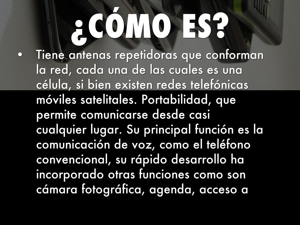 Tiene antenas repetidoras que conforman la red, cada una de las cuales es una célula, si bien existen redes telefónicas móviles satelitales. Portabilidad, que permite comunicarse desde casi cualquier lugar. Su principal función es la comunicación de voz, como el teléfono convencional, su rápido desarrollo ha incorporado otras funciones como son cámara fotográfica, agenda, acceso a Internet, reproducción de video e incluso GPS y reproductor mp3.