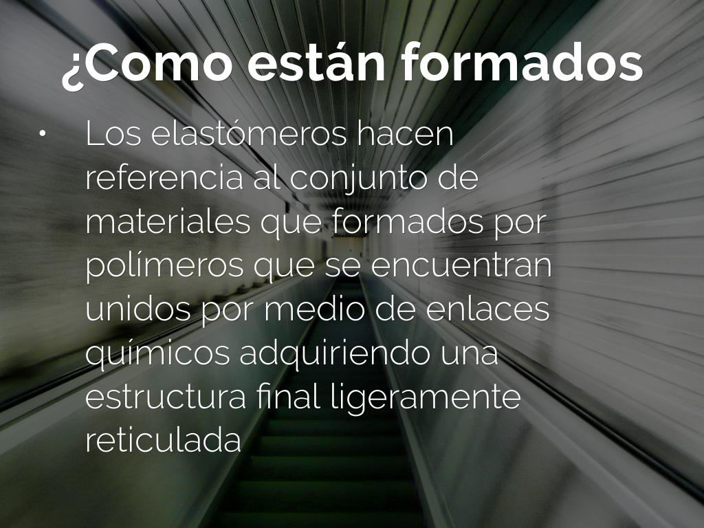 • Los elastómeros hacen referencia al conjunto de materiales que formados por polímeros que se encuentran unidos por medio de enlaces químicos adquiriendo una estructura final ligeramente reticulada