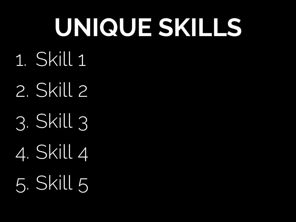 What are 3-5 unique skills that you bring to the table? You can highlight them here. (Bonus tip: If you're on LinkedIn, review what your contacts have endorsed you for to get ideas.)