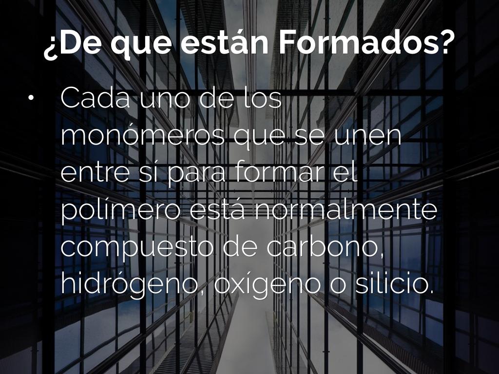• Cada uno de los monómeros que se unen entre sí para formar el polímero está normalmente compuesto de carbono, hidrógeno, oxígeno o silicio.