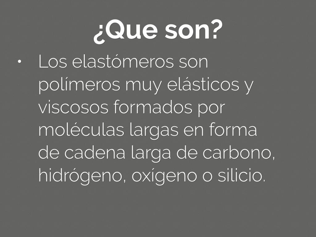 • Los elastómeros son polímeros muy elásticos y viscosos formados por moléculas largas en forma de cadena larga de carbono, hidrógeno, oxígeno o silicio.