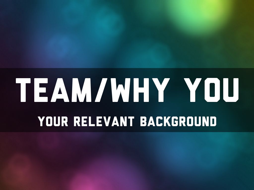 What have you done in the past that has prepared you to take on this new challenge? Why are you well-suited to succeed in this venture? How will others help you, and what relevant skills/experience will they bring to the project? How will you go about building your team from here and adding necessary expertise?
