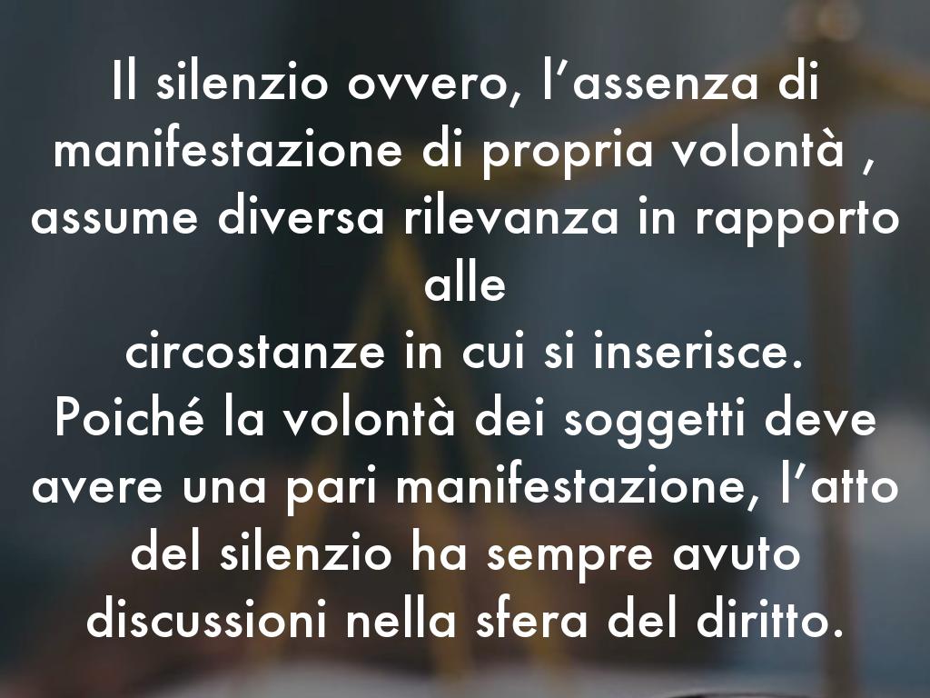 L’opinione affermata dice che il silenzio non puó essere identificato con il consenso, come nel detto “chi tace acconsente”, ma esso puó tuttavia assumere la rilevanza di manifestazione di tacita volontà nel caso in cui la parte interessata esprima una dichiarazione determinata