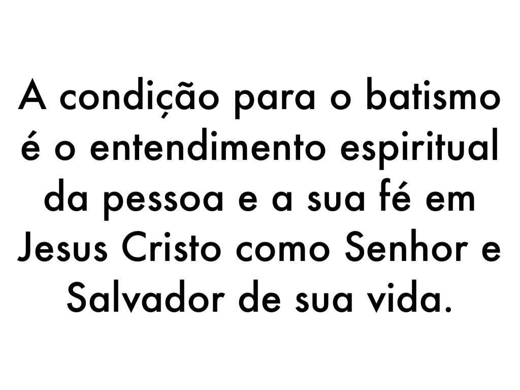 A condição para o batismo é o entendimento espiritual da pessoa e a sua fé em Jesus Cristo como Senhor e Salvador de sua vida.