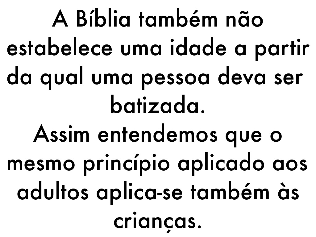 A Bíblia também não estabelece uma idade a partir da qual uma pessoa deva ser batizada.