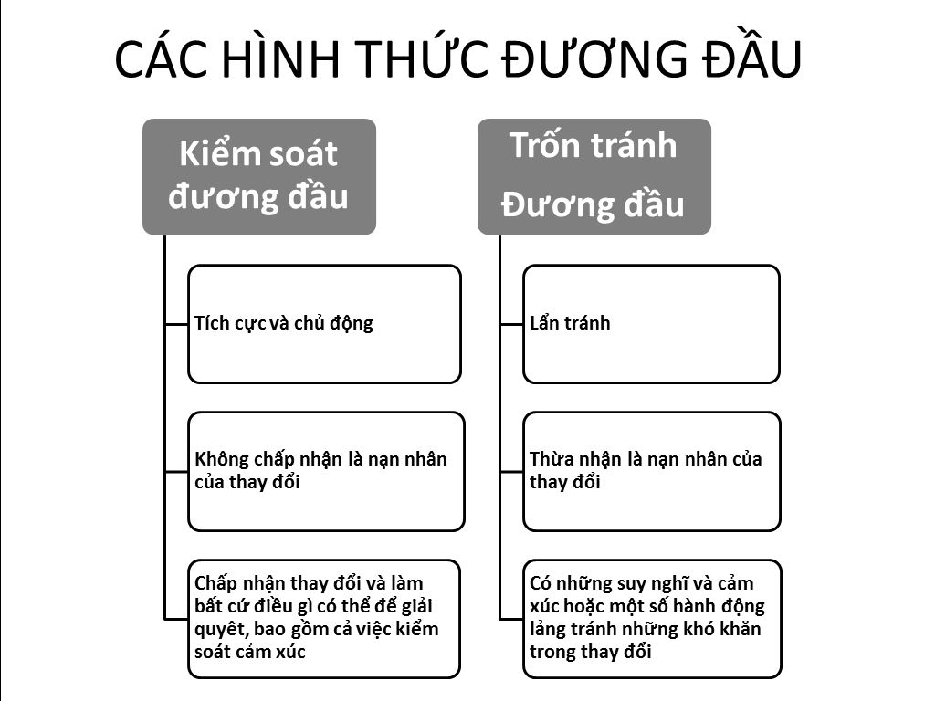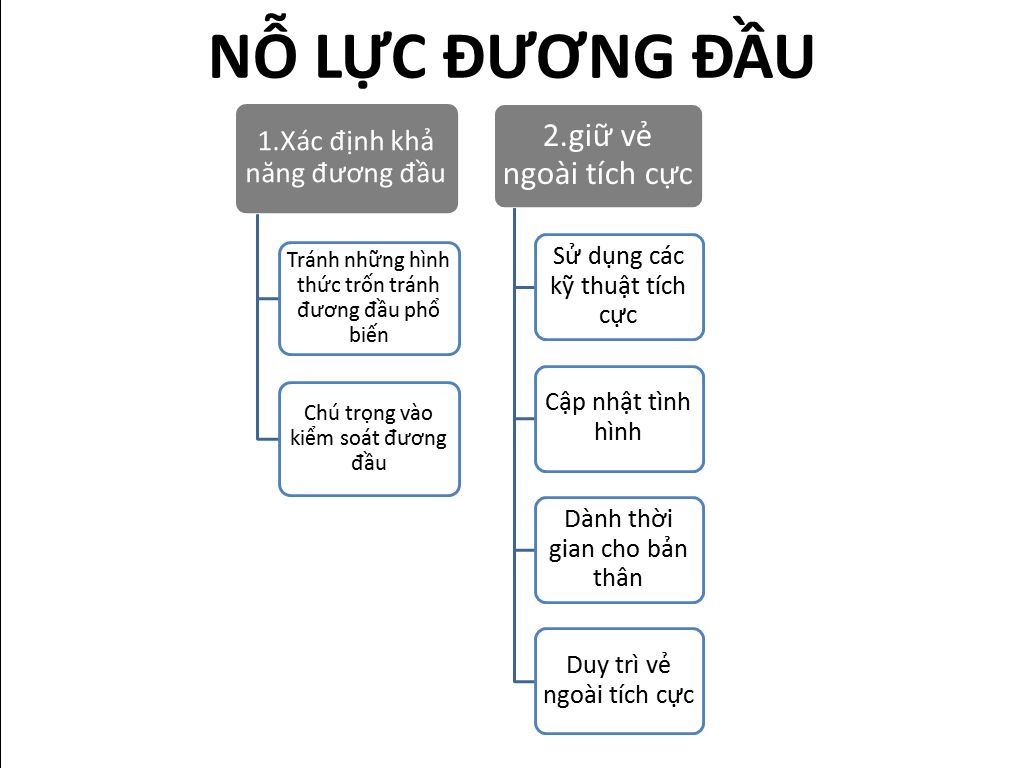 Quan trọng là chúng ta cần tránh hình thức trốn tránh đương đầu thường gặp như uống quá nhiều rượu, kích động quá mức, và những hành vi tiêu cực khác. Thay vào đó, hãy chú trọng vào hình thức kiểm soát đương đầu, và nghĩ về cách chúng ta có thể kiểm soát được tình hình và tạo kết quả tích cực cho bản thân và cho những người xung quanh.