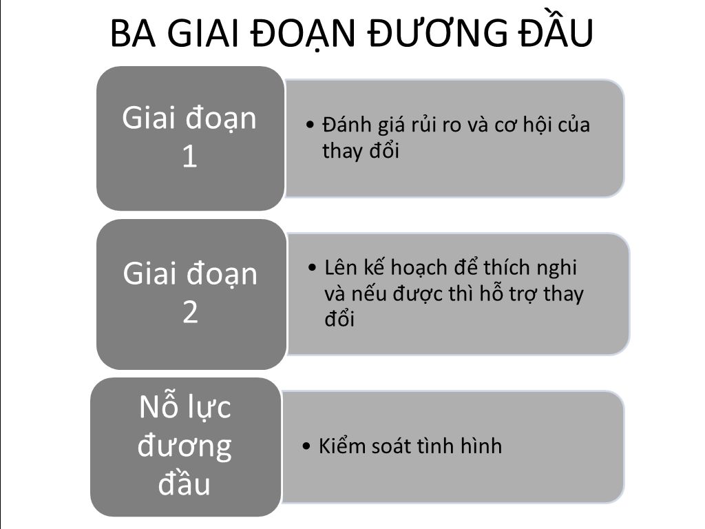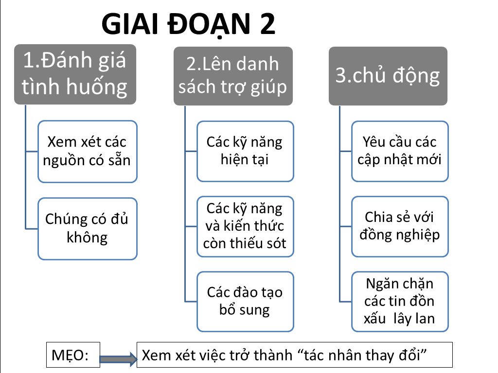 Tiếp theo là chúng ta hãy cập nhật những gì mà các đồng nghiệp đang trải qua. Nếu thay đổi này có ảnh hưởng đến họ thì hãy hỏi xem làm thế nào họ đương đầu với nó. Thường thì việc giúp đỡ người khác cũng có thể giúp đỡ chính bản thân chúng ta một cách hiệu quả.
