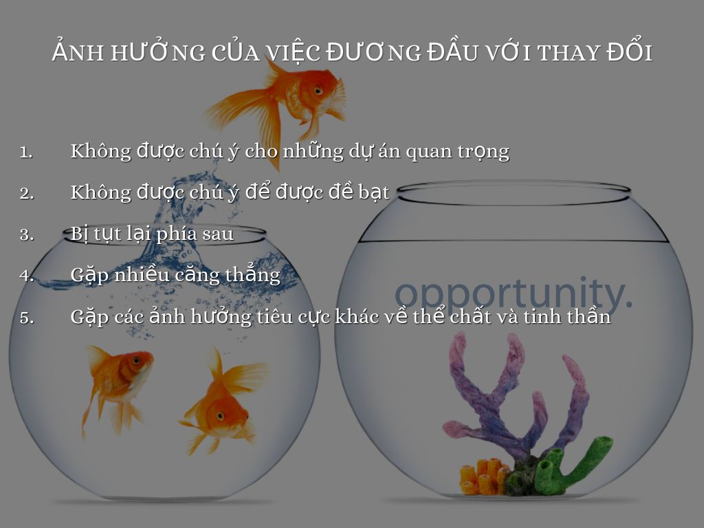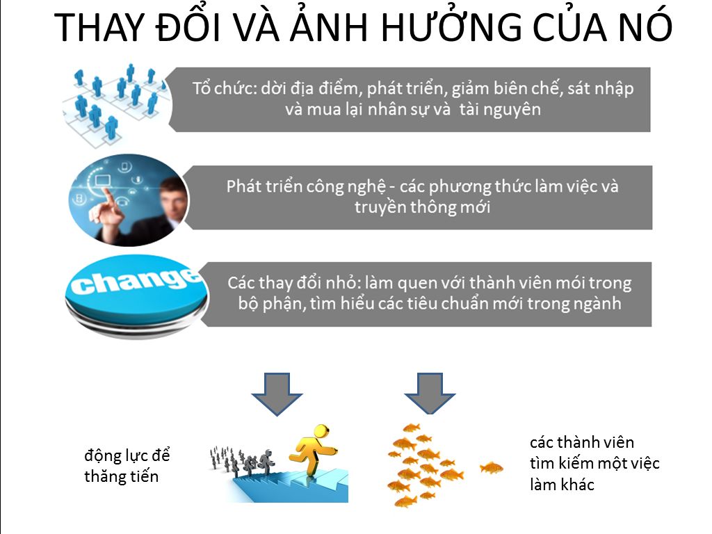 Cuối cùng, hãy cố gắng duy trì vẻ ngoài tích cực về tình huống. Thậm chí nếu một sự thay đổi dường như là tiêu cực lúc ban đầu, thì thường cho kết quả tích cực nếu chúng ta dành thời gian để tìm hiểu nó. Chỉ chúng ta có thể quyết định liệu chúng ta có phát triển được từ tình huống đó không hay chúng ta để nó ảnh hưởng tiêu cực đến bản thân.