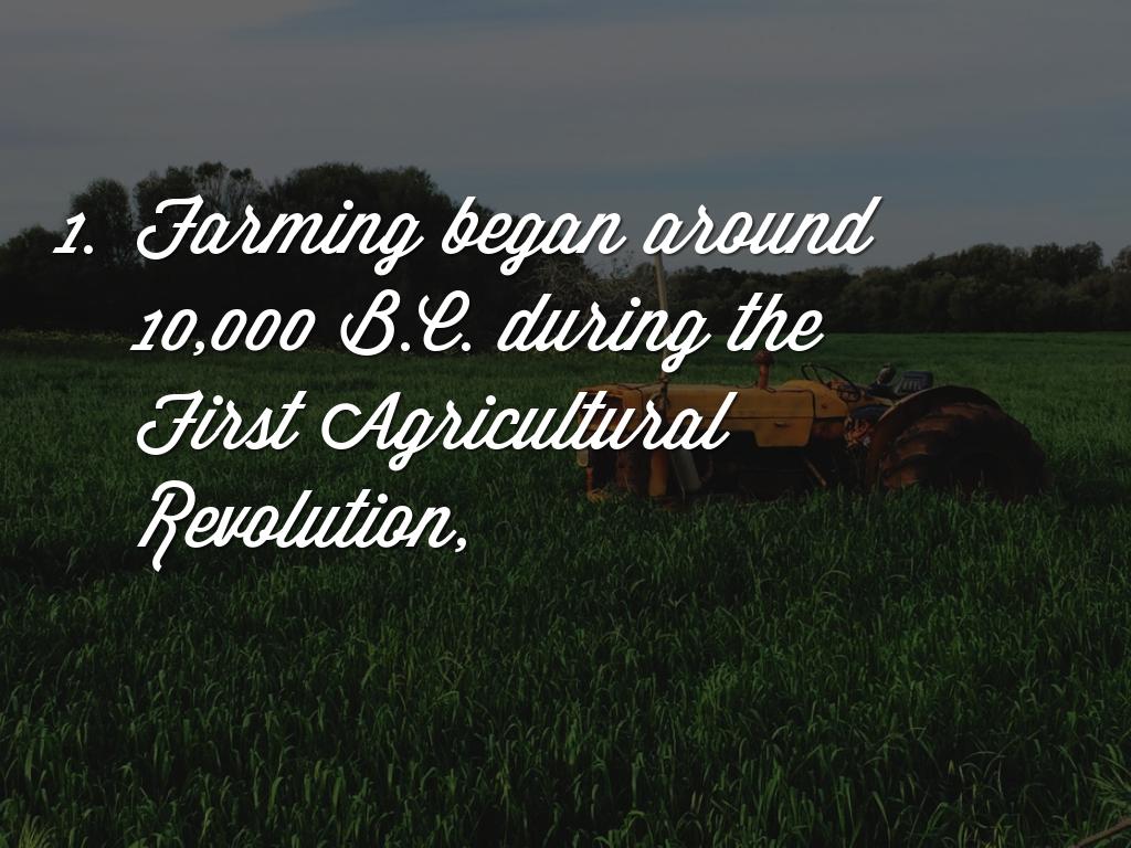 Farming began around 10,000 B.C. during the First Agricultural Revolution,
