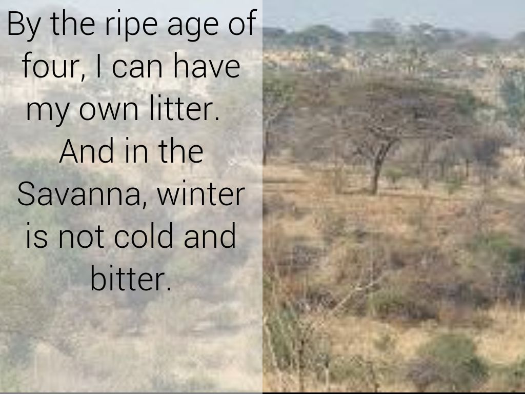 By the ripe age of four, I can have my own litter. And in the Savanna, winter is not cold and bitter.