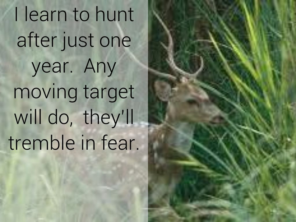 I learn to hunt after just one year. Any moving target will do, they’ll tremble in fear.