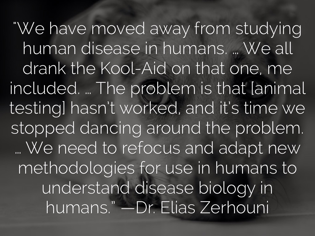 "We have moved away from studying human disease in humans. … We all drank the Kool-Aid on that one, me included. … The problem is that [animal testing] hasn’t worked, and it’s time we stopped dancing around the problem. … We need to refocus and adapt new methodologies for use in humans to understand disease biology in humans.” —Dr. Elias Zerhouni