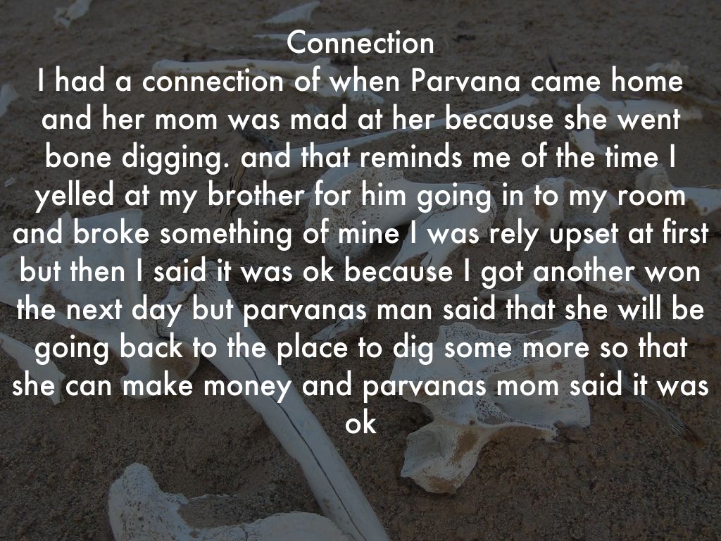 Connection I had a connection of when Parvana came home and her mom was mad at her because she went bone digging. and that reminds me of the time I yelled at my brother for him going in to my room and broke something of mine I was rely upset at first but then I said it was ok because I got another won the next day but parvanas man said that she will be going back to the place to dig some more so that she can make money and parvanas mom said it was ok
