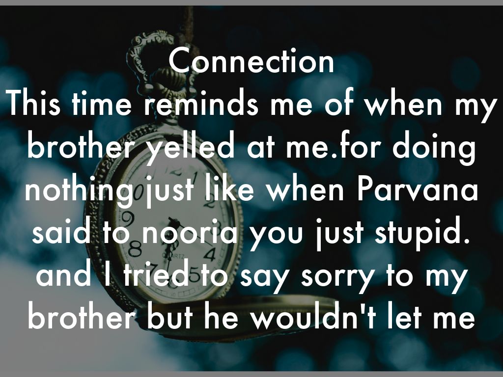 Connection This time reminds me of when my brother yelled at me.for doing nothing just like when Parvana said to nooria you just stupid. and I tried to say sorry to my brother but he wouldn't let me
