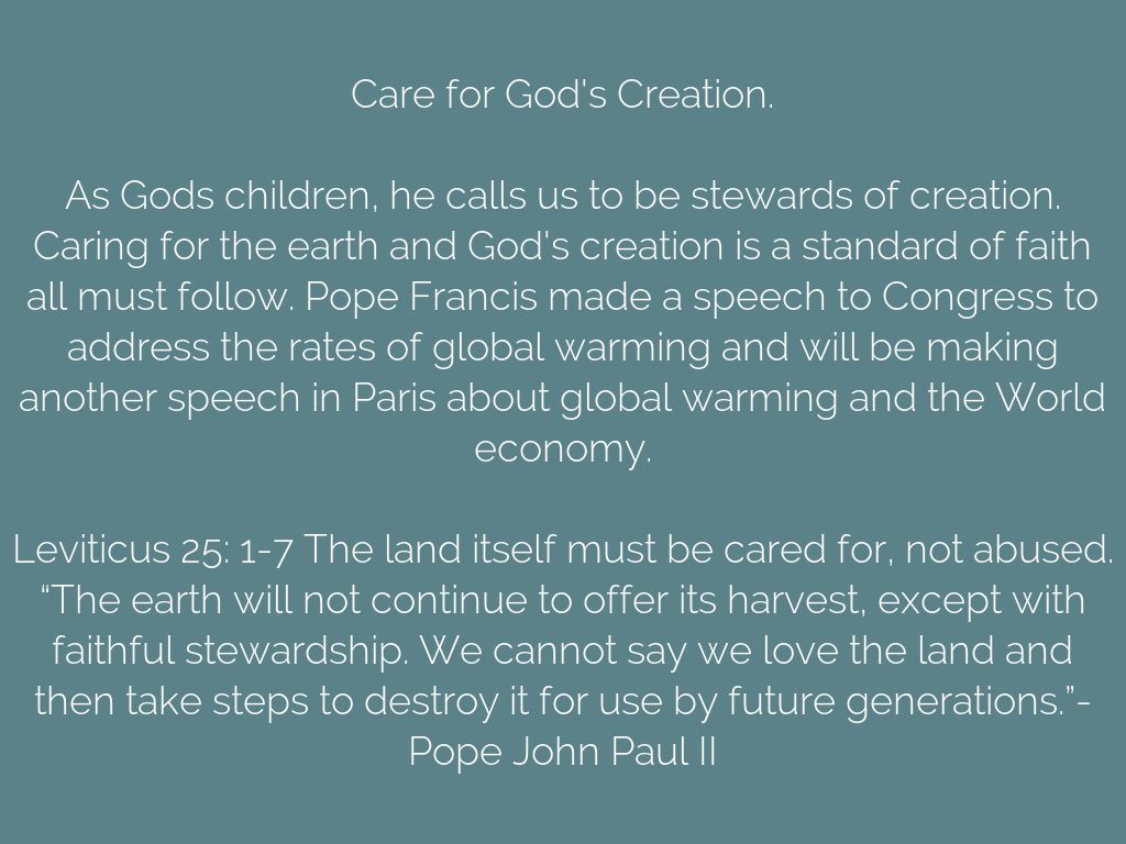 As Gods children, he calls us to be stewards of creation. Caring for the earth and God's creation is a standard of faith all must follow. Pope Francis made a speech to Congress to address the rates of global warming and will be making another speech in Paris about global warming and the World economy.