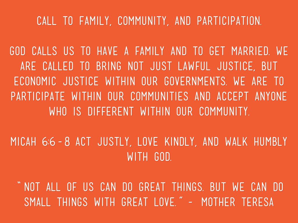 God calls us to have a family and to get married. We are called to bring not just lawful justice, but economic justice within our governments. We are to participate within our communities and accept anyone who is different within our community.