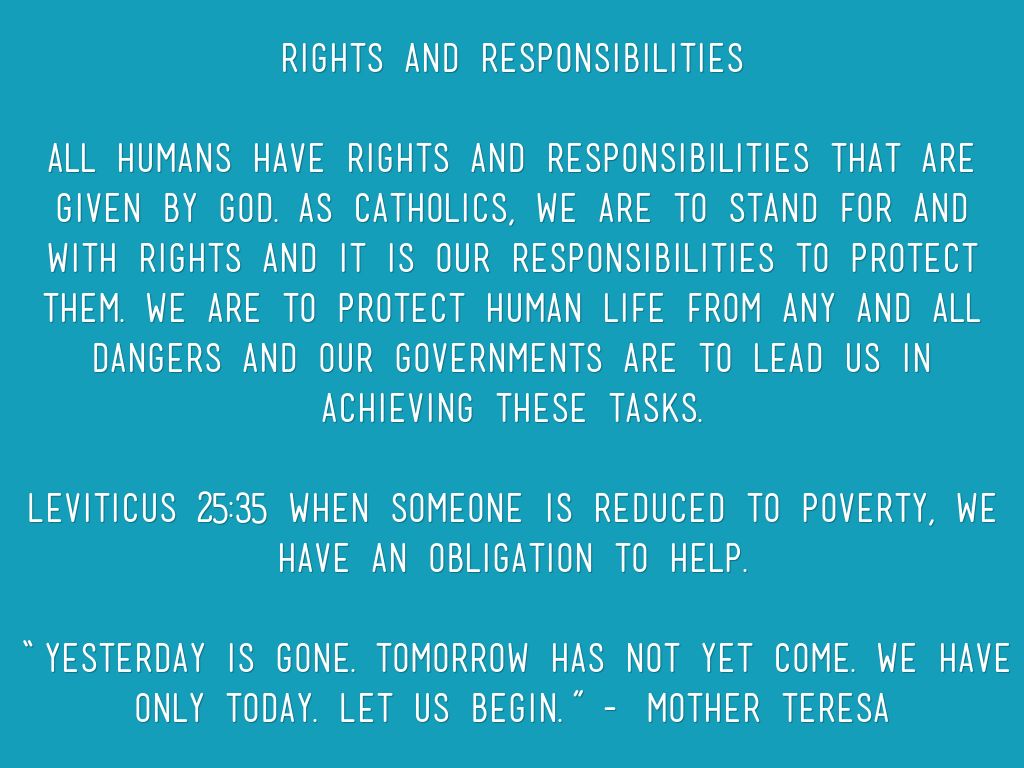 All humans have rights and responsibilities that are given by God. As Catholics, we are to stand for and with rights and it is our responsibilities to protect them. We are to protect human life from any and all dangers and our governments are to lead us in achieving these tasks.