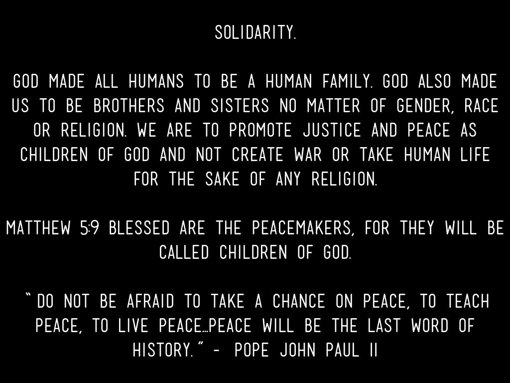 God made all humans to be a human family. God also made us to be brothers and sisters no matter of gender, race or religion. We are to promote justice and peace as children of God and not create war or take human life for the sake of any religion.