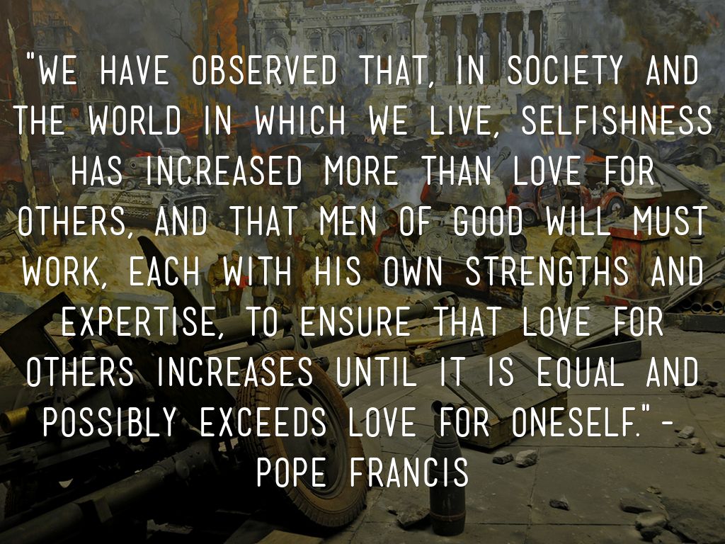 "We have observed that, in society and the world in which we live, selfishness has increased more than love for others, and that men of good will must work, each with his own strengths and expertise, to ensure that love for others increases until it is equal and possibly exceeds love for oneself."- Pope Francis