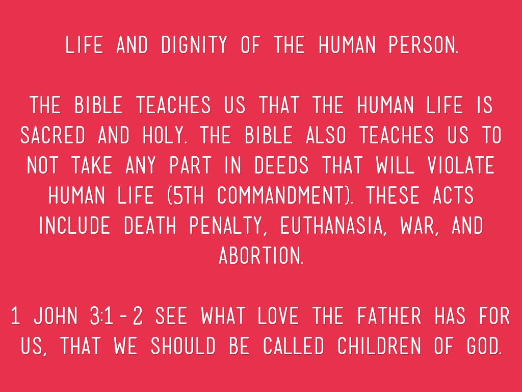 The Bible teaches us that the human life is sacred and holy. The Bible also teaches us to not take any part in deeds that will violate human life (5th Commandment). These acts include death penalty, euthanasia, war, and abortion.