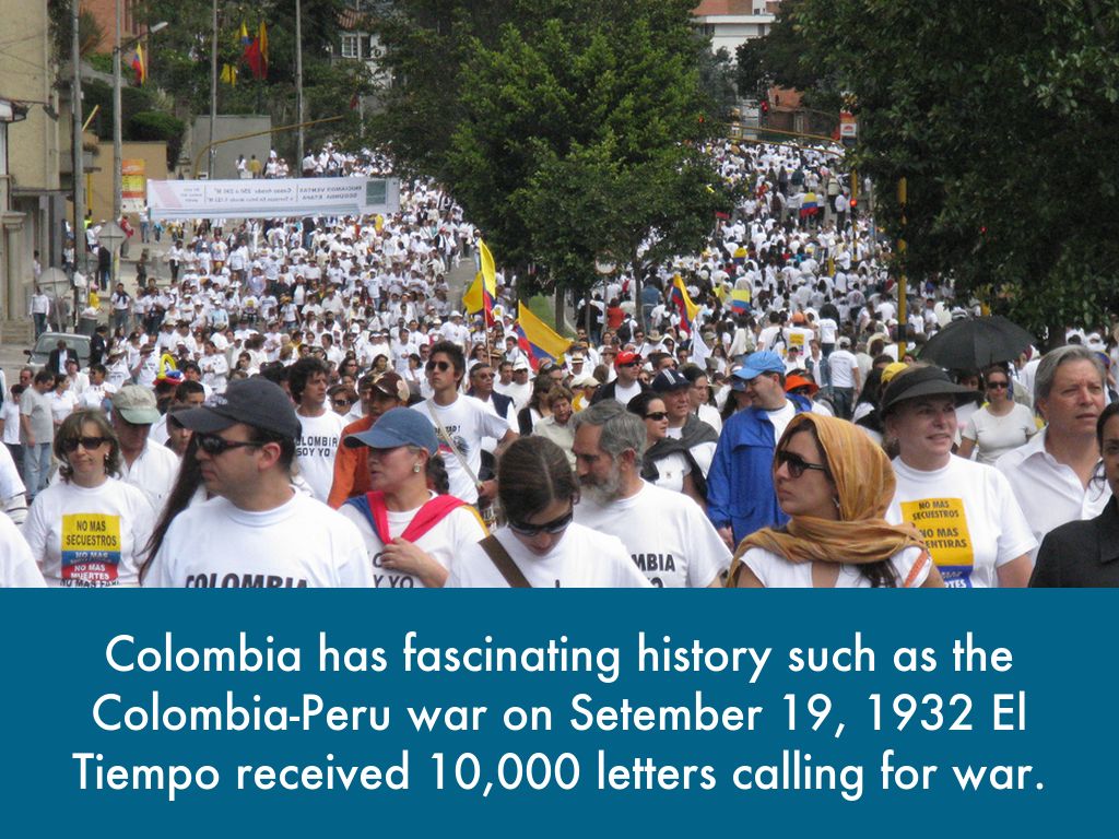 Colombia has fascinating history such as the Colombia-Peru war on Setember 19, 1932 El Tiempo received 10,000 letters calling for war.